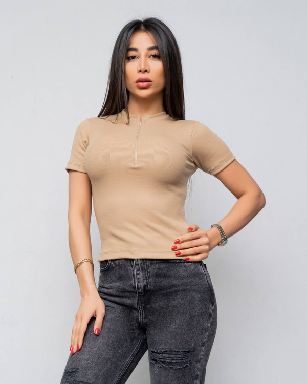 کراپ تیشرتی آستین کوتاه جلو نیم زیپ کبریتی
